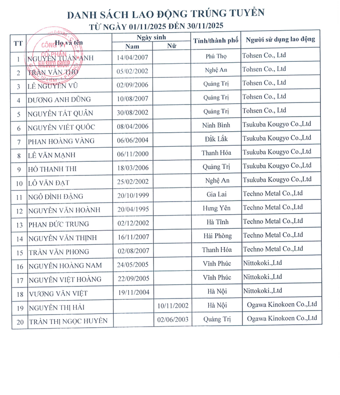 Danh Sách Lao Động Trúng Tuyển 01/11 đến 30/11/2025