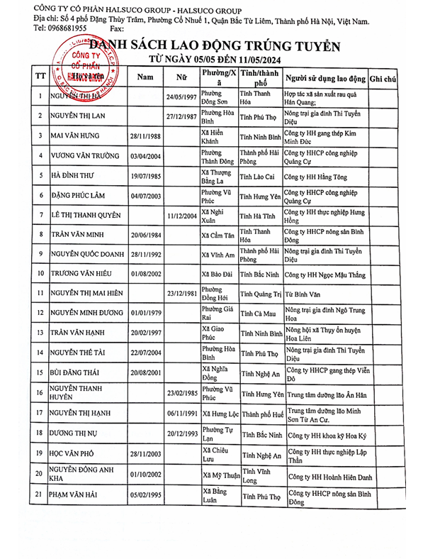 Danh Sách Lao Động Trúng Tuyển 05/05 đến 11/05/2024