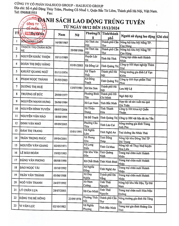 Danh Sách Lao Động Trúng Tuyển 08/12 đến 15/12/2024