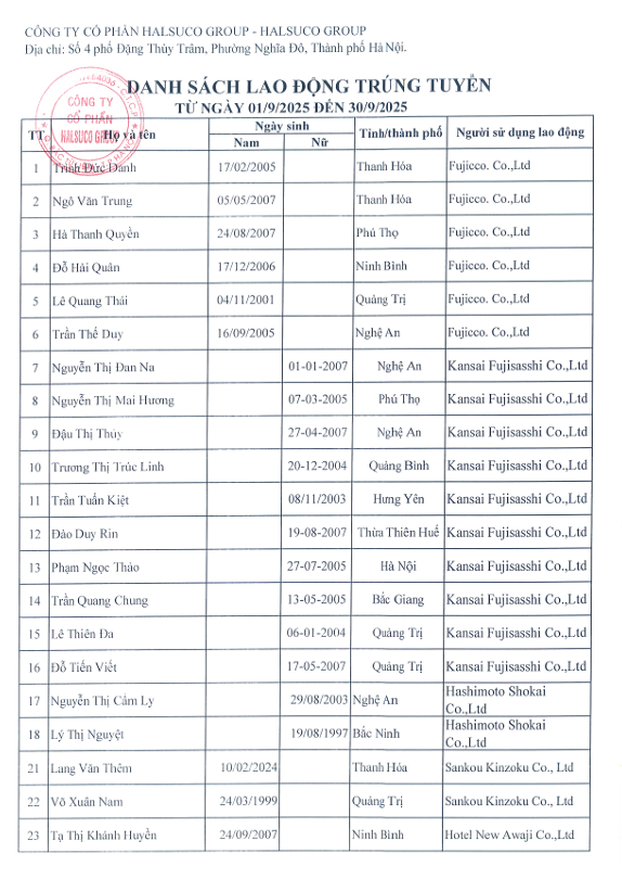 Danh Sách Lao Động Trúng Tuyển Danh Sách Lao Động Trúng Tuyển 1/09 đến 30/09/2025 Danh Sách Lao Động Trúng Tuyển 10/08 đến 20/09/2025 Danh Sách Lao Động Trúng Tuyển 15/10 đến 26/10/2024 Danh Sách Lao Động Trúng Tuyển 01/12 đến 12/12/2023 13/12/2025 Danh Sách Lao Động Trúng Tuyển 01/11 đến 30/11/2025 01/12/2025 Danh Sách Lao Động Trúng Tuyển 1/10 đến 31/10/2025 01/11/2025 Danh Sách Lao Động Trúng Tuyển 25/10 đến 30/10/2024 31/10/2025 Danh Sách Lao Động Trúng Tuyển 15/10 đến 26/10/2024 28/10/2025 Danh Sách Lao Động Trúng Tuyển 10/08 đến 20/09/2025 21/09/2025