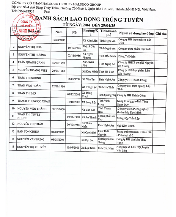 Danh Sách Lao Động Trúng Tuyển Danh Sách Lao Động Trúng Tuyển 12/04 đến 29/04/2025 Danh Sách Lao Động Trúng Tuyển 12/04 đến 17/04/2024 Danh Sách Lao Động Trúng Tuyển 11/05 đến 19/05/2024 Danh Sách Lao Động Trúng Tuyển 01/12 đến 12/12/2023 13/12/2025 Danh Sách Lao Động Trúng Tuyển 01/11 đến 30/11/2025 01/12/2025 Danh Sách Lao Động Trúng Tuyển 1/10 đến 31/10/2025 01/11/2025 Danh Sách Lao Động Trúng Tuyển 25/10 đến 30/10/2024 31/10/2025 Danh Sách Lao Động Trúng Tuyển 15/10 đến 26/10/2024 28/10/2025 Danh Sách Lao Động Trúng Tuyển 1/09 đến 30/09/2025 02/10/2025