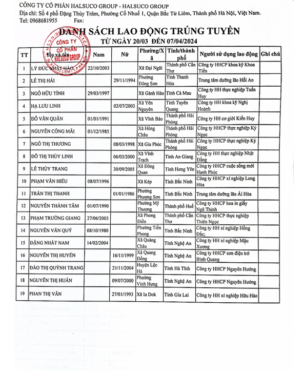 Danh Sách Lao Động Trúng Tuyển 20/03 đến 07/04/2024