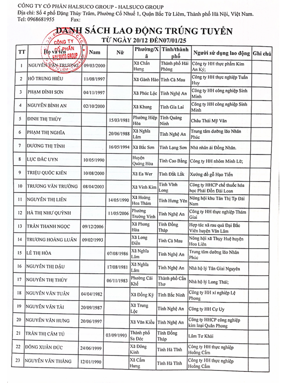 Danh Sách Lao Động Trúng Tuyển 20/12/2024 đến 07/01/2025