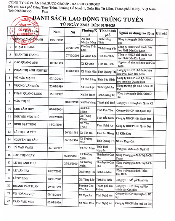 Danh Sách Lao Động Trúng Tuyển 22/03 đến 01/04/2025